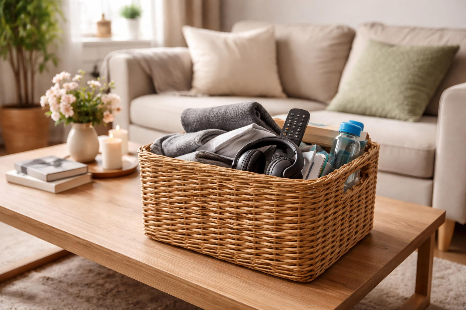 Glavna skrivnost hitrega čiščenja je, da čim bolj zmanjšate svoje gibanje po prostorih. Vse raztresene predmete pospravite v en prostoren koš, ki ga boste kasneje pospravili, in v trenutku boste odpravili vizualni kaos.